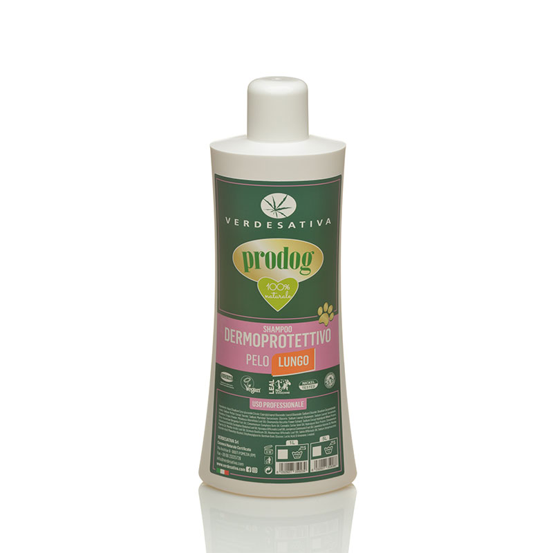 Lo shampoo Prodog è una formulazione specifica a ph fisiologico, attentamente studiata per rispettare la pelle sensibile del cane e mantenere la giusta idratazione del mantello. I puri oli essenziali e i tensioattivi di origine vegetale, lo rendono altamente dermocompatibile e soprattutto esercitano un’azione detergente delicata ed efficace allo stesso tempo. L’Olio di Canapa Sativa in sinergia con il gel di Aloe e gli Oligoelementi minerali assicura l’apporto di notevoli elementi nutritivi per la pelle (vitamina E, omega3 e 6) e purifica il manto senza irritarlo, rendendolo forte, resistente e brillante. L’estratto di Tea Tree dermopurificante esercita un’azione balsamica ed insetto repellente mentre l’Olio di Bergamotto agisce come disinfettante, battericida ed antisettico. Lo Shampoo Prodog “Pelo lungo” è indicato per mantelli lunghi e arruffati, difficili da districare e tendenti al crespo e ai nodi. E’ ottimale per una detersione profonda poiché il pelo lungo assorbe maggiormente la polvere e nasconde lo sporco intrappolandolo nei nodi. Lo shampoo lascia sul mantello una profumazione fresca e delicata e previene la formazione dei cattivi odori grazie all’aroma dell’olio essenziale di Rosmarino, Menta Piperita e degli estratti di Salvia.