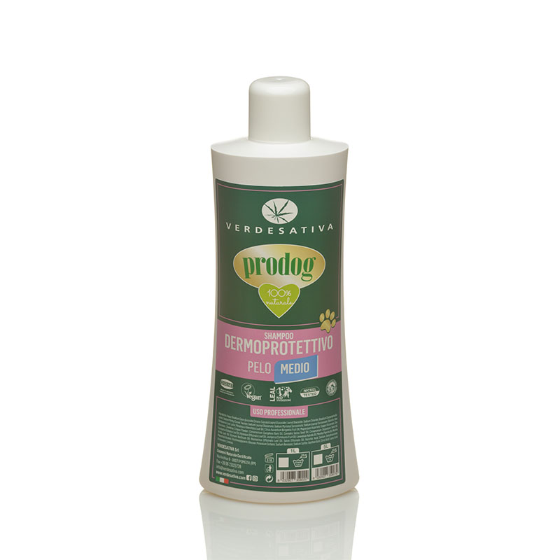 Lo shampoo Prodog è una formulazione specifica a ph fisiologico, attentamente studiata per rispettare la pelle sensibile del cane e mantenere la giusta idratazione del mantello. I puri oli essenziali e i tensioattivi di origine vegetale, lo rendono altamente dermocompatibile e soprattutto esercitano un’azione detergente delicata ed efficace allo stesso tempo. L’Olio di Canapa Sativa in sinergia con il gel di Aloe e gli Oligoelementi minerali assicura l’apporto di notevoli elementi nutritivi per la pelle (vitamina E, omega3 e 6) e purifica il manto senza irritarlo, rendendolo forte, resistente e brillante. L’estratto di Tea Tree dermopurificante esercita un’azione balsamica ed insetto repellente mentre l’Olio di Bergamotto agisce come disinfettante, battericida ed antisettico. Lo Shampoo Prodog “Pelo medio” è indicato per mantelli di media lunghezza con particolare tendenza ai nodi. E’ ottimale per una detersione profonda: ha un buon potere igienizzante e previene la formazione di cattivi odori. Conferisce una fresca profumazione al manto in virtù degli aromi di Salvia, Rosmarino e Lavanda.